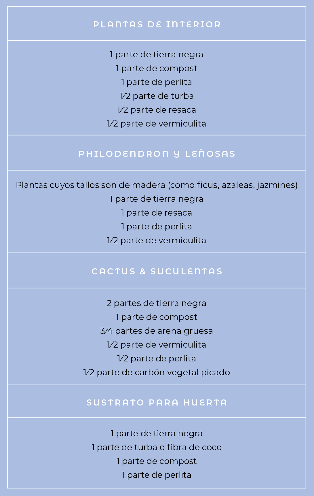 Para cada familia de plantas existe un sustrato ideal, que se prepara mezclando componentes base (tierra, compost, perlita, turba, etc). Cada componente aporta distintas características al sustrato final.