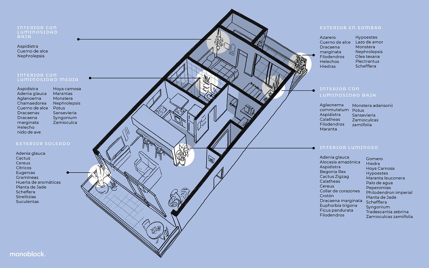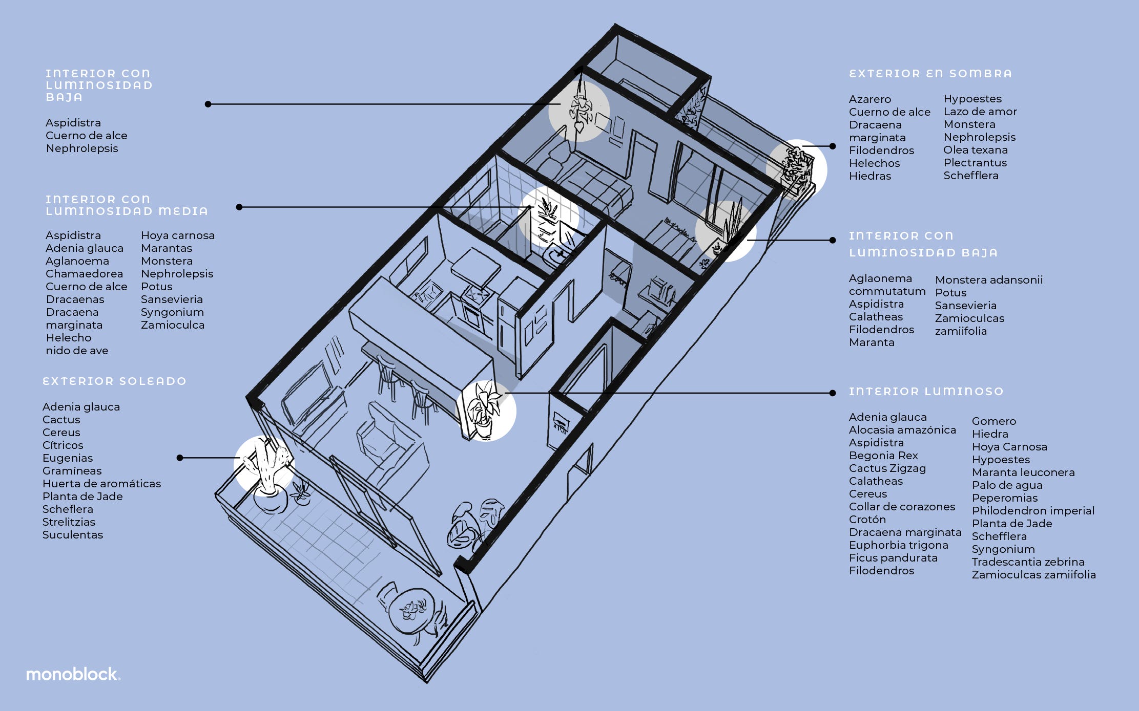 Nosotras ideamos un sistema al que llamamos mapa botánico: un plano que te permitirá identificar fácilmente las características de cada ambiente de tu casa o lugar de trabajo para elegir las plantas que mejor se adapten a esos espacios.